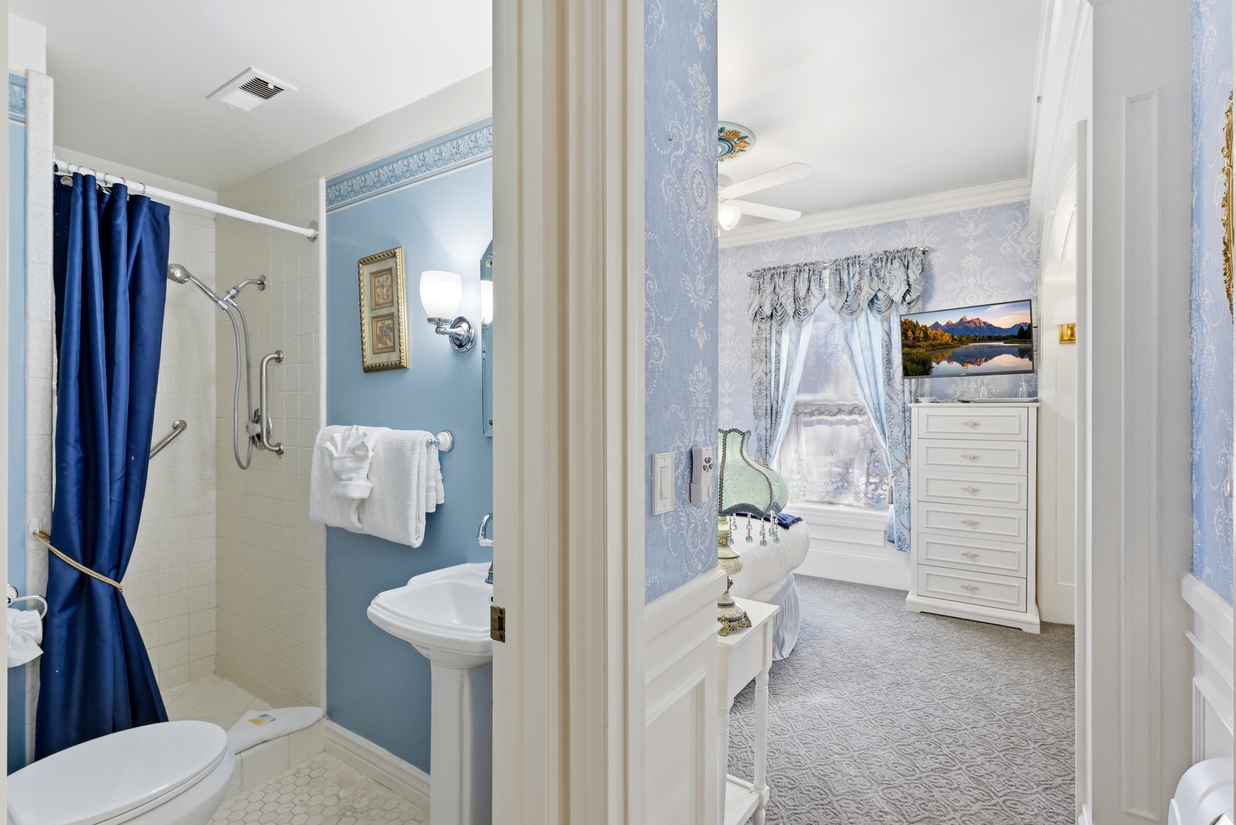 The corner location gives you dual-window light without sacrificing privacy. The spa tub is legitimately spacious, and the room has a calm, settled feel—one that prioritizes comfortable rather than precious.